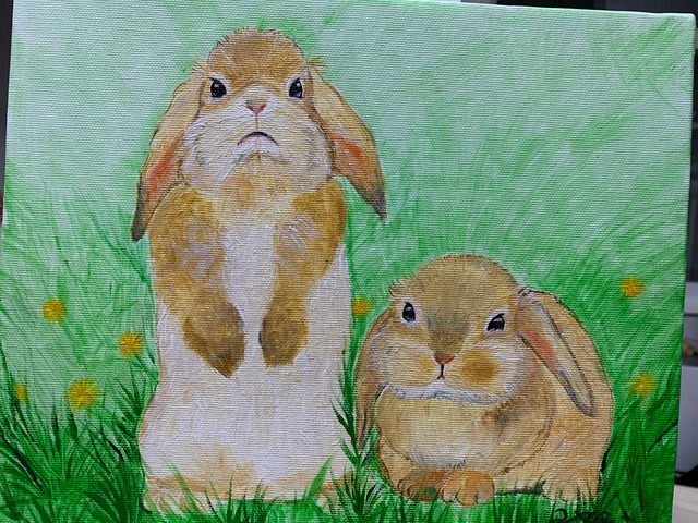 F3サイズです。野原で遊ぶウサギたちです。緑がいっぱいの中を自由に遊べたらもっと幸せなのかもしれないと思い、描いてみました。