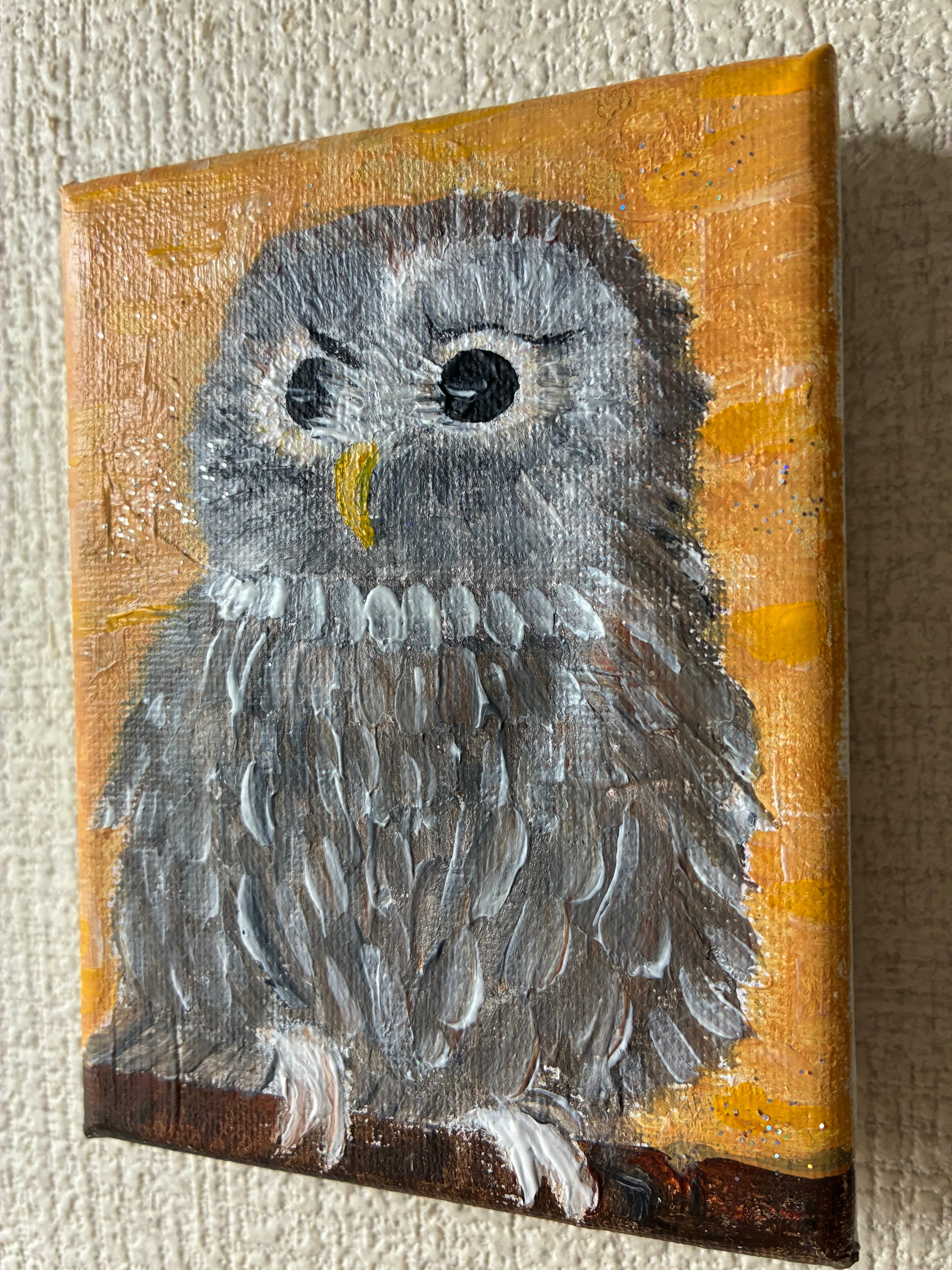 サイズは、横10.7cm、縦12.8cmの小さなサイズです!ふくろうの可愛らしさを描きました。