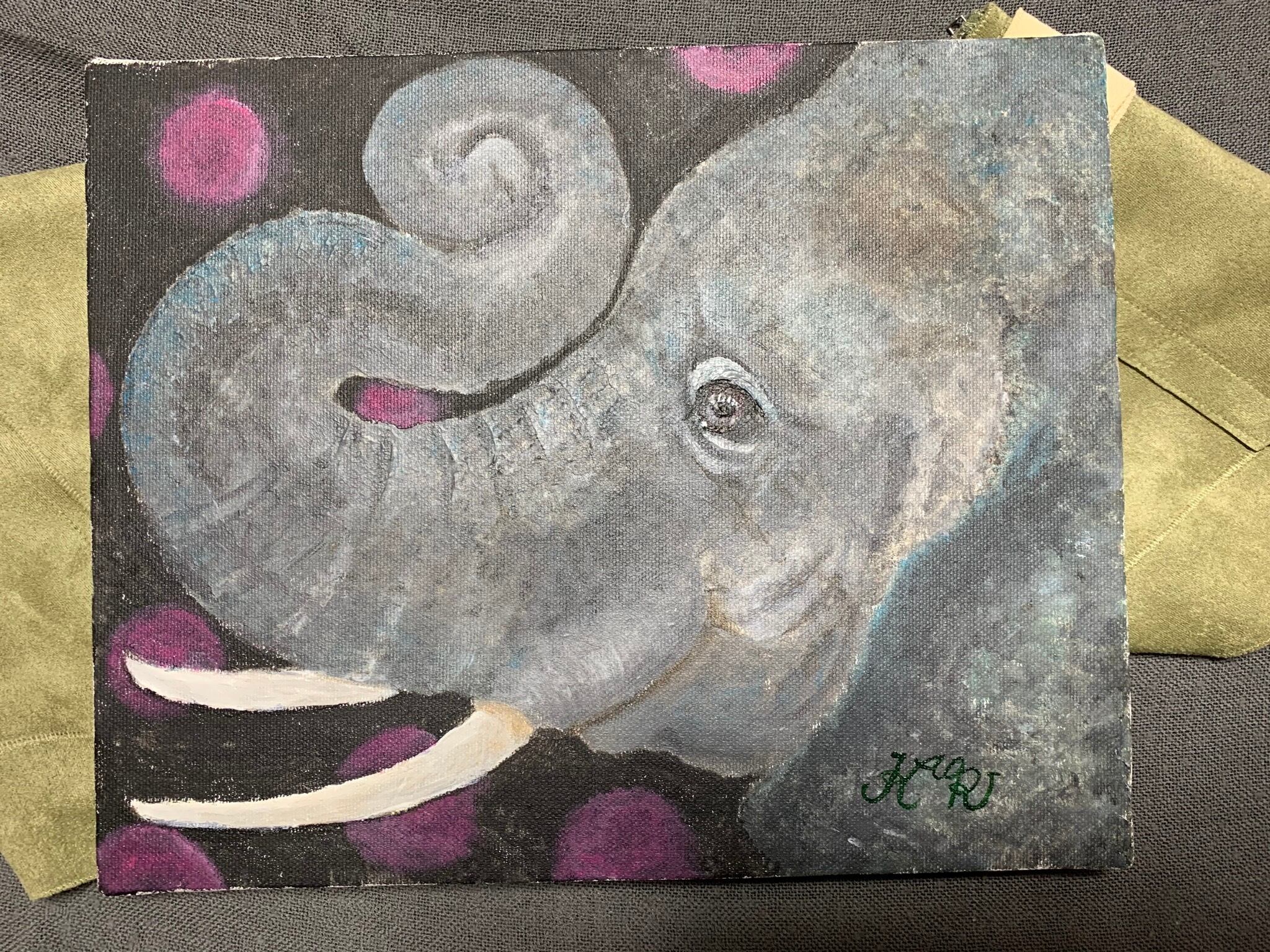 背景のドット柄でサーカスの人懐っこい、人間好きな象をイメージして描きました。