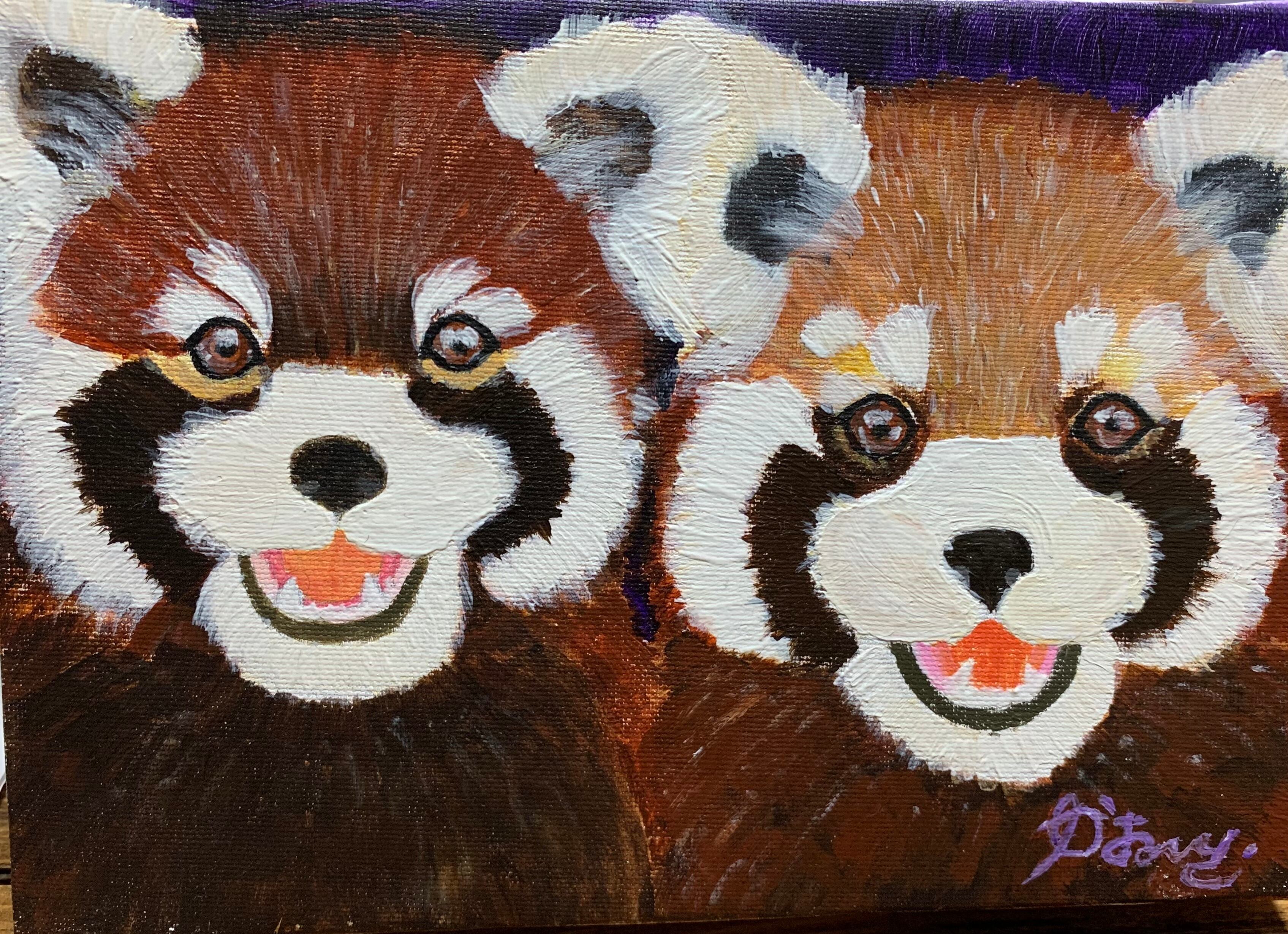 サイズはSMです。仲良しなレッサーパンダ2匹をキャンバスいっぱいに描きました。 笑っているような可愛らしい表情に癒されてくれたら嬉しいです。