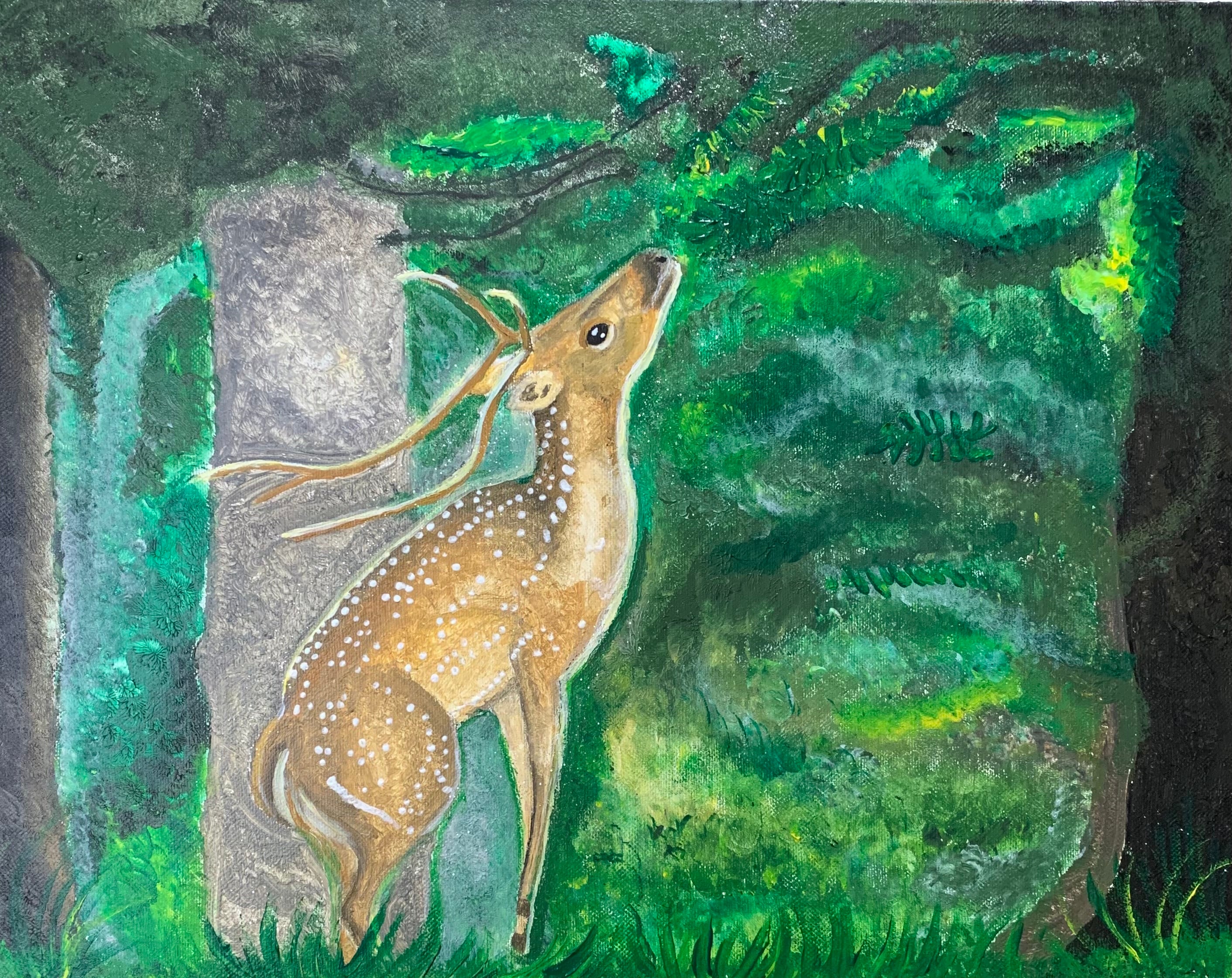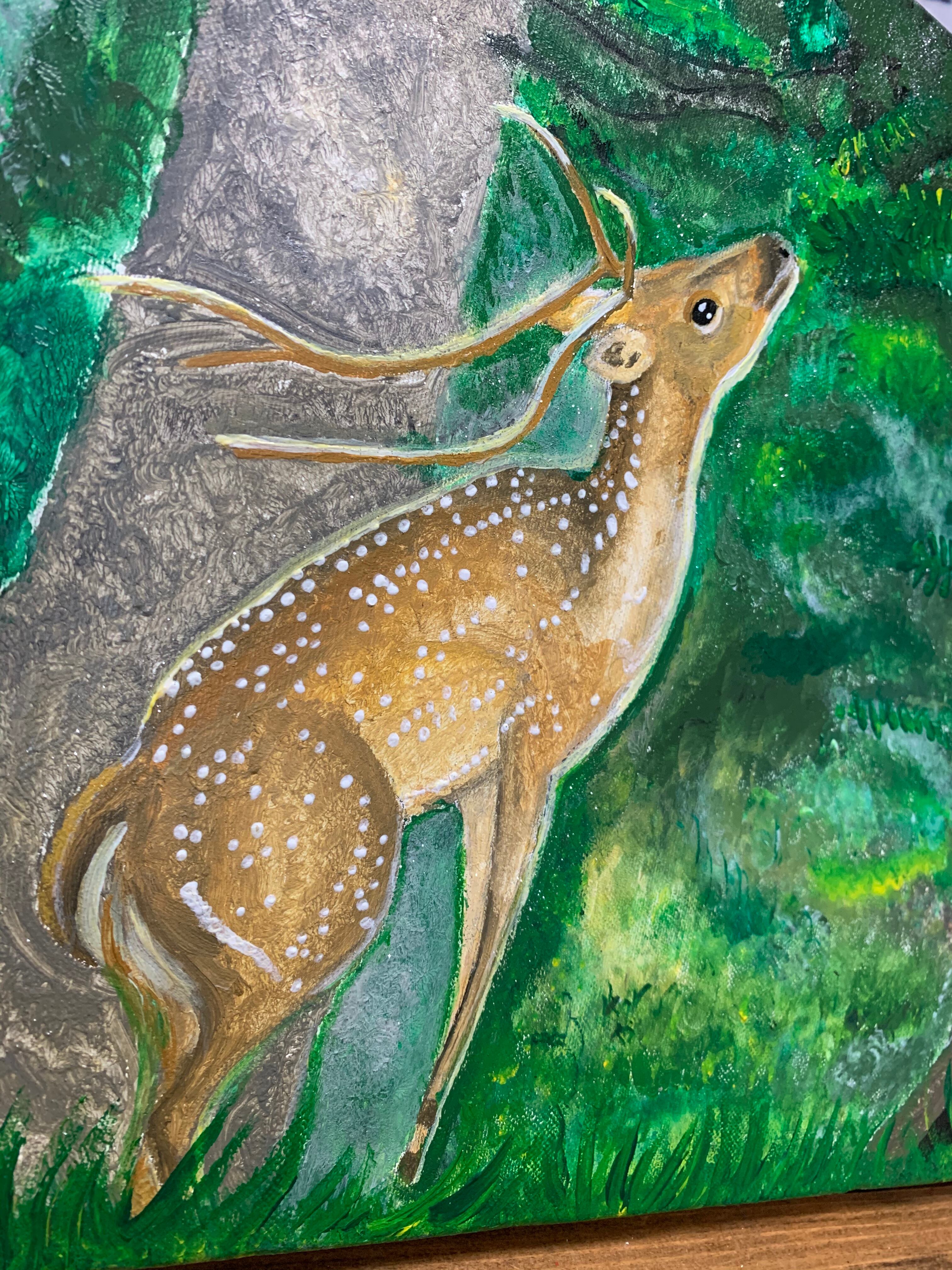 サイズはF6です。森の中でお日様の光を見上げ自然のありがたさに、感謝している様子を現した絵です。ラメも使っているので実物はキラキラしています。描いてるうちに楽しくなり、指で森の様子を描き現しました。雑な部分もありますが、私なりの味だと思っています。筆でたたいたり、指でポンポンたたいて描いたり、スポンジでたたいたりして描いたので、少し変わったように見えるかもしれません。