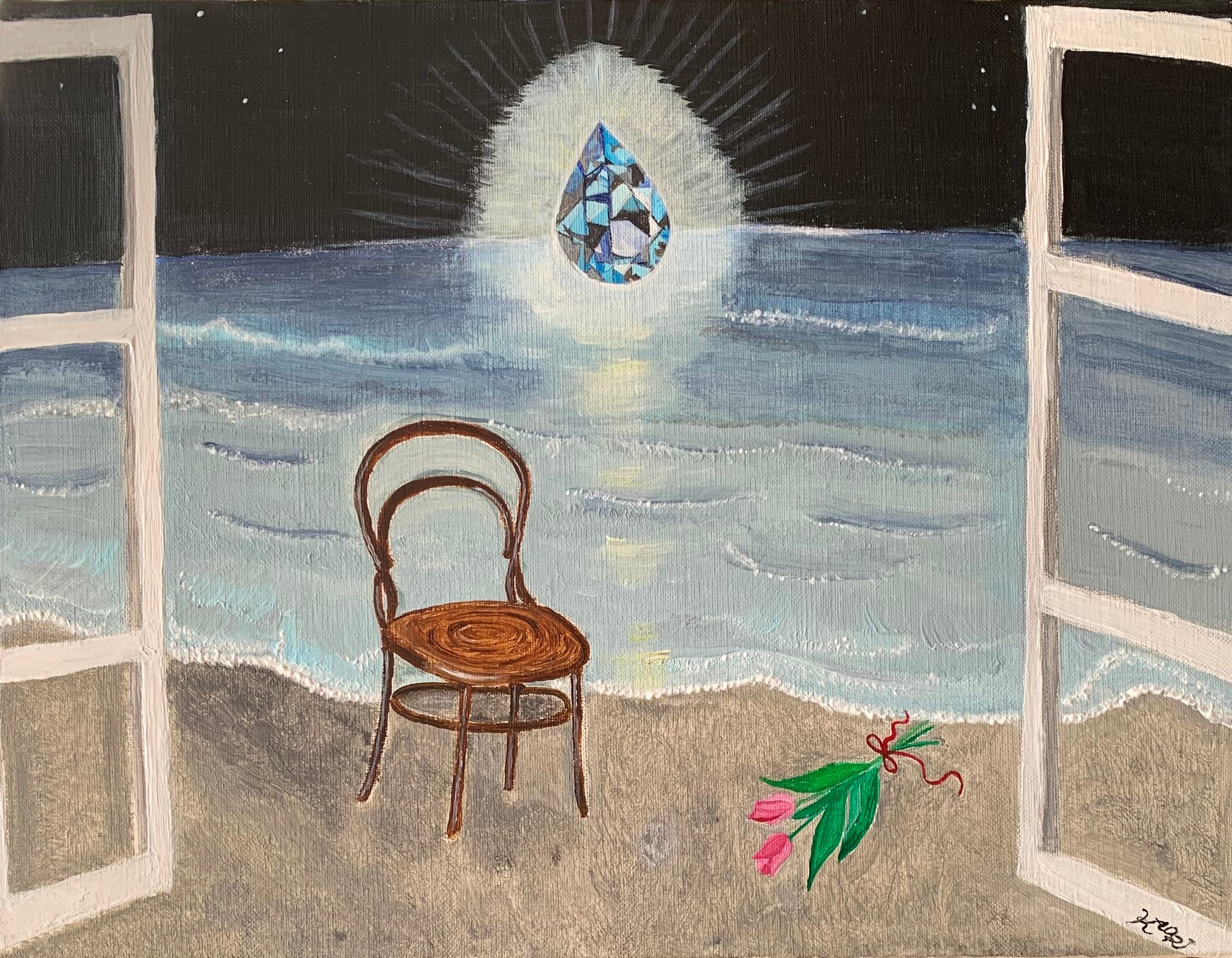 サイズはF6です。静かに揺らぐ波と、輝く宝石のカケラを集めて1つにした物、また、ここで逢いたいと願う気持ちを、曲からイメージして描いてみました。ラメも使っているので、光の加減でキラキラします。