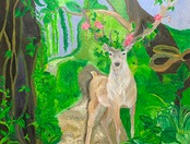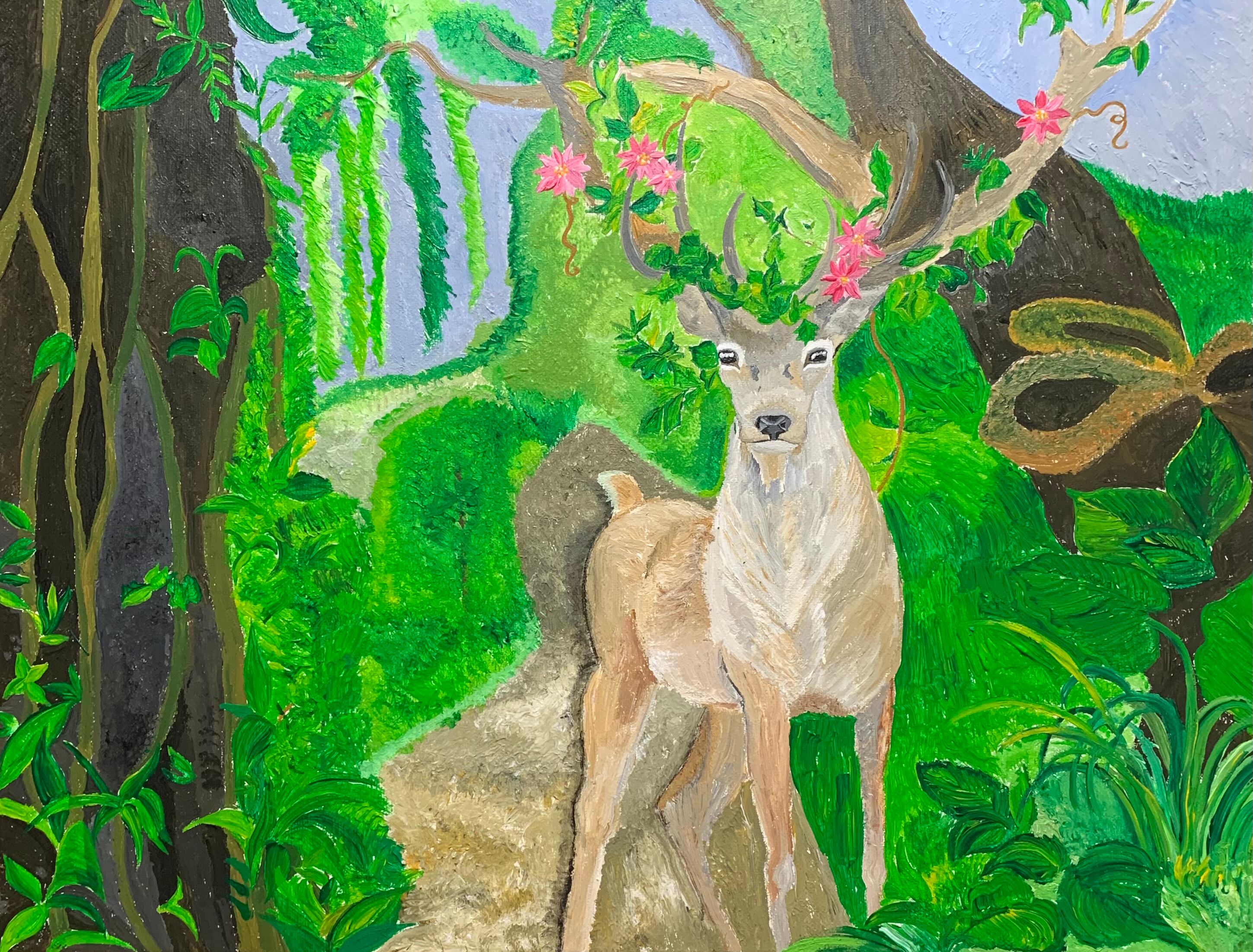 サイズはF6です。森の中で雄シカが、角に草花をからめた姿です。オシャレをしてこれから、大好きな相手に逢いに行くのかな?そんな可愛い様子を思い浮かべて描きました。
