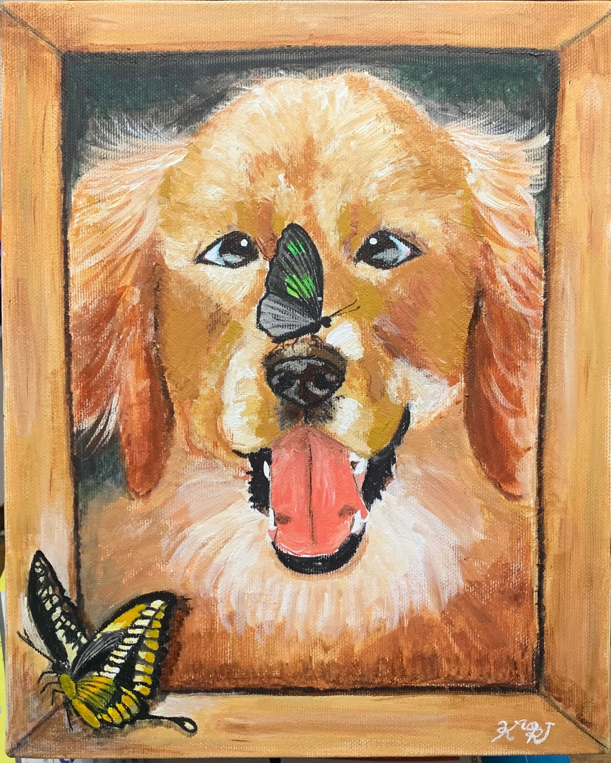 サイズはF3です。わんちゃんの鼻先に止まる蝶々、額縁から飛び立つ蝶々…このまま額縁からわんちゃんも飛び出して来そうなイメージで寄り目の可愛らしい犬を描きました。
